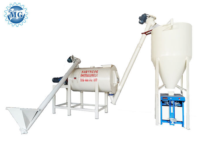 Βάσει της πολυ-σπειροειδούς μηχανής μίξης κονιάματος κορδελλών ξηράς, αυτή η ξηρά γραμμή παραγωγής παλτών αφρού κονιάματος προσθέτει έναν δευτεροβάθμιο ανυψωτικό μεταφορέα βιδών, μια χοάνη ολοκληρωμένων προϊόντων και μια αυτόματη μηχανή συσκευασίας βαλβίδων, οι οποίοι διαμορφώνουν ένα πλήρες σύνολο απλής ξηράς γραμμής παραγωγής κονιάματος από την υλική σίτιση, την αυτόματη διαδικασία παραγωγής μίξης, πλήρωσης και συσκευασίας.